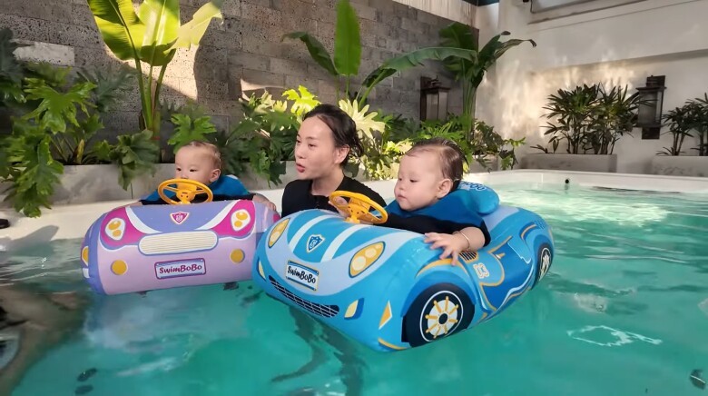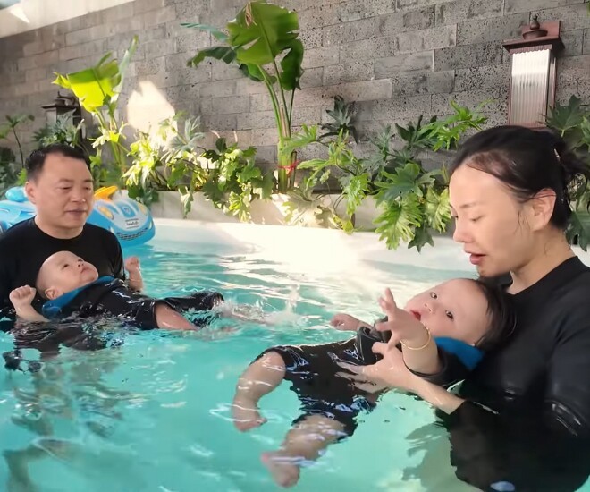 Cặp song sinh nhà Phương Oanh được học bơi khi mới 1 tuổi.