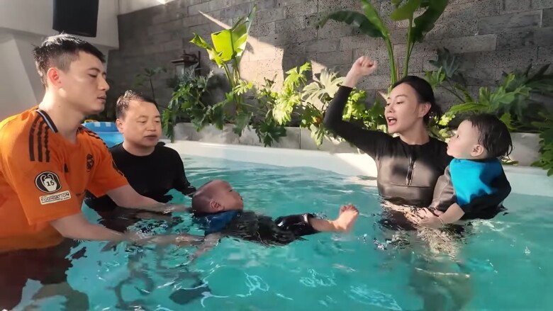 Trong video, vợ chồng "cá mập" vừa phối hợp với huấn luyện viên, vừa động viên cặp song sinh để từng bước thực hiện các động tác như đạp chân, học cách nổi trên nước. Ban đầu, Jimmy - Jenny tỏ vẻ bối rối tuy nhiên càng về sau, 2 nhóc tì càng tận hưởng với buổi học.