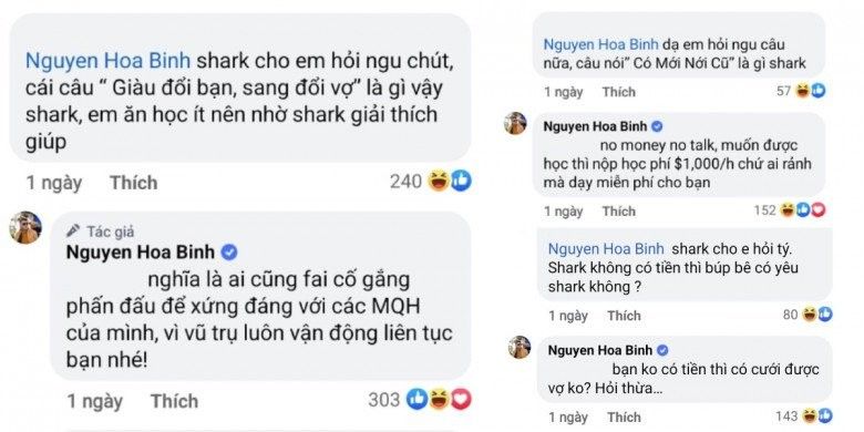 Không ngại khi bị hỏi, Shark Bình thẳng thắn đáp trả: "Nghĩa là ai cũng phải cố gắng phấn đấu để xứng đáng với các mối quan hệ của mình, vì vũ trụ vận động liên tục bạn nhé". Khi một người khác thắc mắc: "Shark cho em hỏi tí, Shark không có tiền thì 'búp bê' có yêu Shark không?", doanh nhân Nguyễn Hòa Bình đã cho rằng câu hỏi trên là thừa và phản hồi rằng: "Bạn không có tiền thì có cưới được vợ không?".