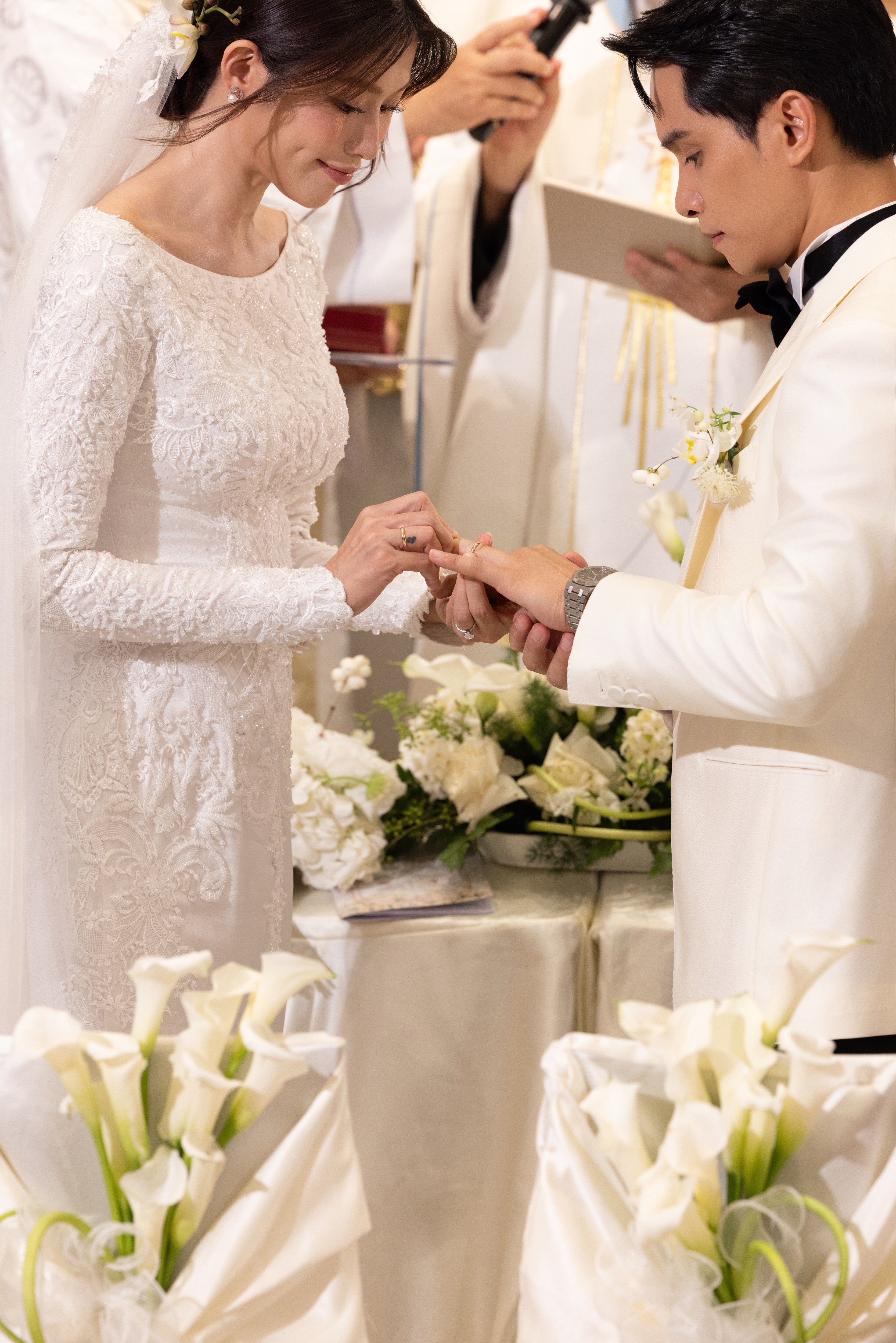 Đến giờ làm lễ, Á hậu Quỳnh Châu và doanh nhân Ngọc Phát cùng bước vào lễ đường. Trong nghi thức thánh lễ, cả 2 cầm tay trao nhau lời hẹn ước gắn bó trọn đời.
