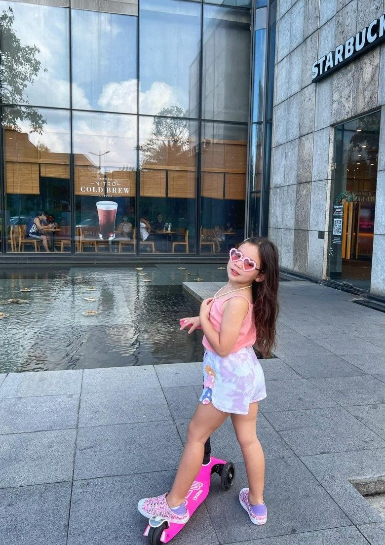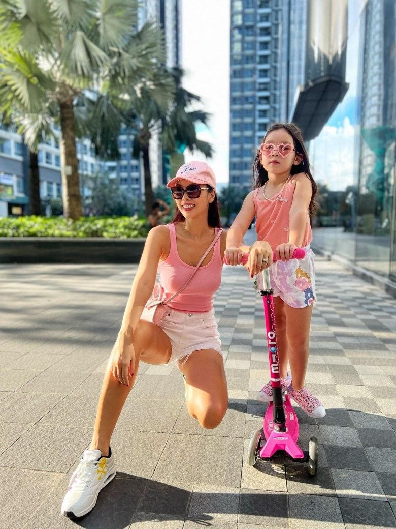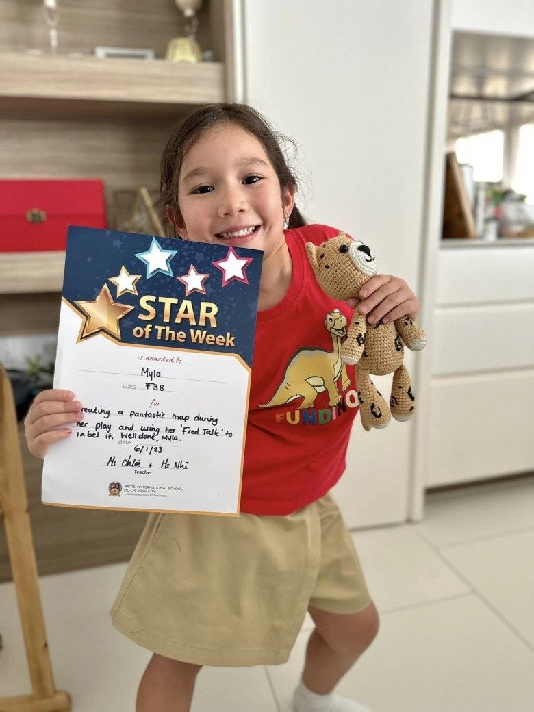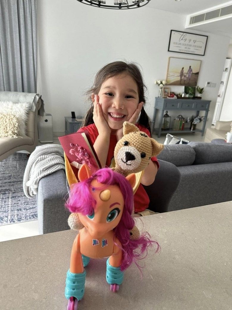 "Em bé đã đi học 'nghiêm chỉnh' thêm một năm nữa rồi. Ở trường cô giáo bắt đầu dạy cách nhận diện, đánh vần mặt chữ bằng tiếng Anh, nên mẹ cũng muốn em làm quen với chữ tiếng Việt. Mẹ không đặt áp lực em phải biết đọc hay biết viết sớm, chỉ không muốn em là cô gái Việt Nam 50%, lại sống ở Việt Nam mà không biết đọc tiếng Việt thì ơ hay hoá ra mù chữ à? Thế nên mẹ cũng mời cô giáo đến chơi với em ở nhà, giúp em làm quen với mặt chữ tiếng Việt một cách tự nhiên nhất" - nữ siêu mẫu từng chia sẻ.