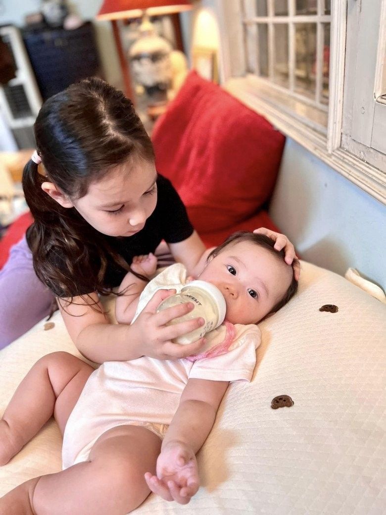 Tuy nhiên với những người hâm mộ thường xuyên theo dõi nữ siêu mẫu thì có thể nhanh chóng nhận ra, em bé sơ sinh chính là em gái cùng cha khác mẹ của siêu mẫu Hà Anh. Tức là Myla đang thực hành chăm cho người... dì bé nhỏ của mình.