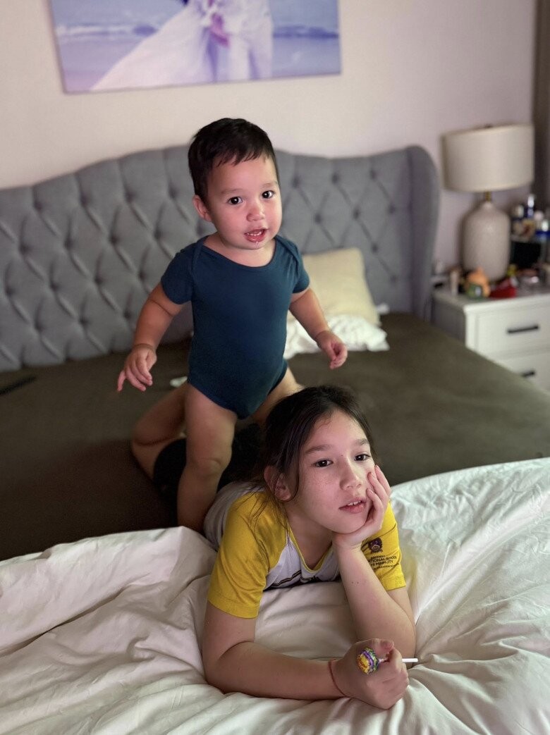 Bé Myla ngày càng ra dáng chị cả, biết chăm sóc em trai Luca phụ bố mẹ.