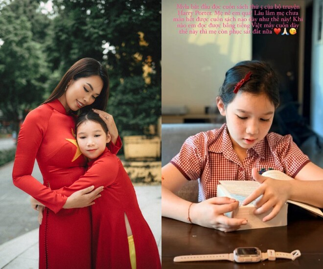 Mới đây, Hà Anh đã chia sẻ khoảnh khắc ái nữ Myla đang chăm chú đọc sách. Nữ siêu mẫu bày tỏ sự nể phục dành cho con gái vì bé đủ kiên trì để xem hết quyển sách dày cộm. Cô cũng không nén được mong chờ một ngày nào đó bé Myla cũng có thể đọc những cuốn sách bằng tiếng Việt như vậy.