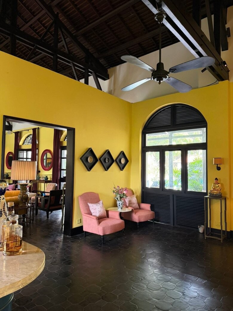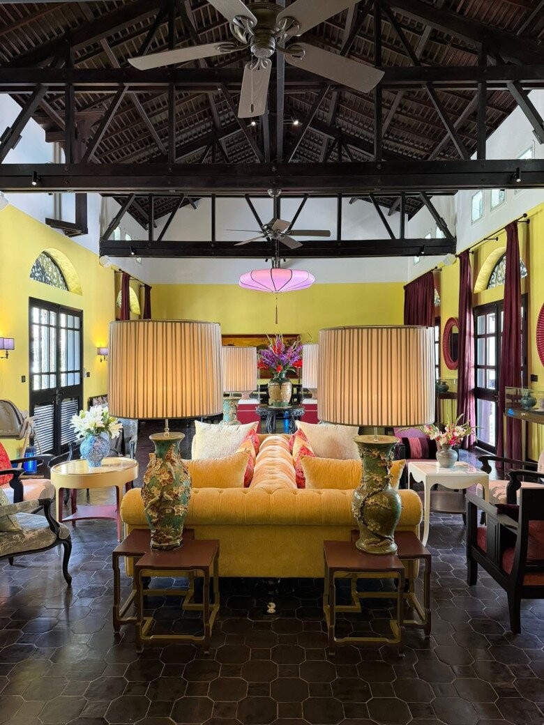 Phòng khách chính mang đậm hơi thở Indochine với trần cao để lộ hệ kèo gỗ vững chãi. Sự phối trộn táo bạo giữa sắc vàng quyền quý của tường, sofa nhung cùng cặp đèn gốm sứ độc bản tạo nên một không gian tiếp khách vừa bề thế, vừa đậm chất nghệ thuật độc bản.
