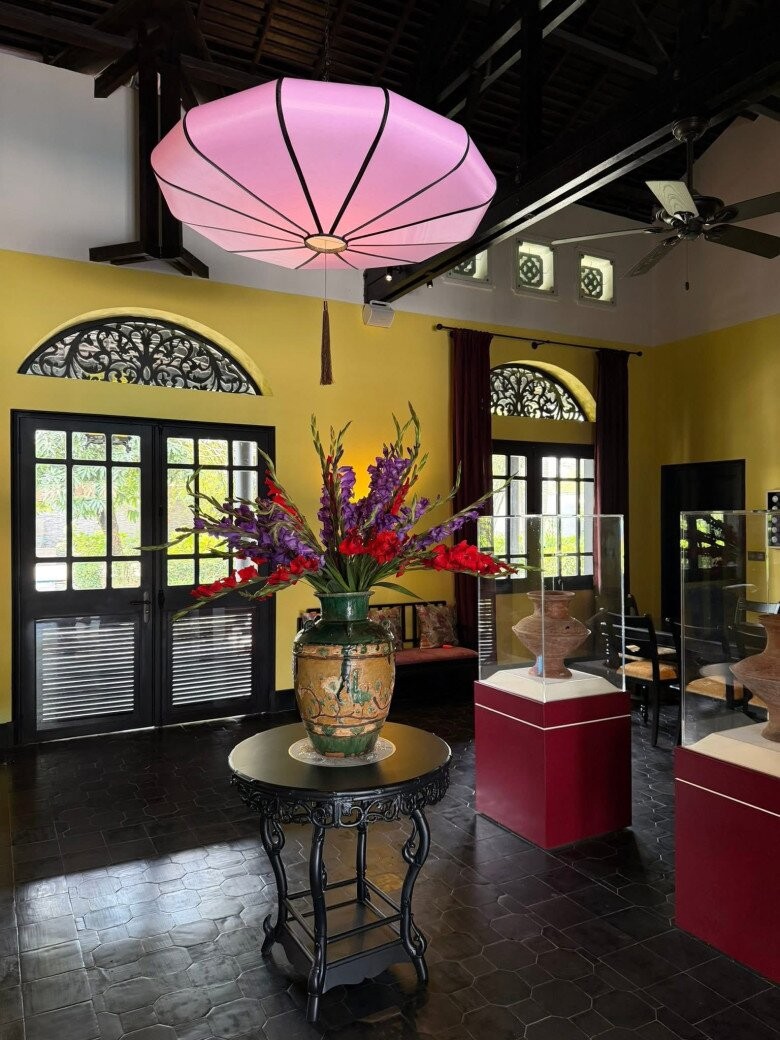 Khu vực sảnh trưng bày được thiết kế như một bảo tàng thu nhỏ với các món đồ gốm cổ và đèn lồng lụa cỡ lớn. Từng chi tiết từ hoa sắt cửa sổ đến bàn trà chạm trổ đều được sắp đặt tỉ mỉ, tôn vinh gu thẩm mỹ tinh tế và sự trân trọng di sản của Chi Bảo.