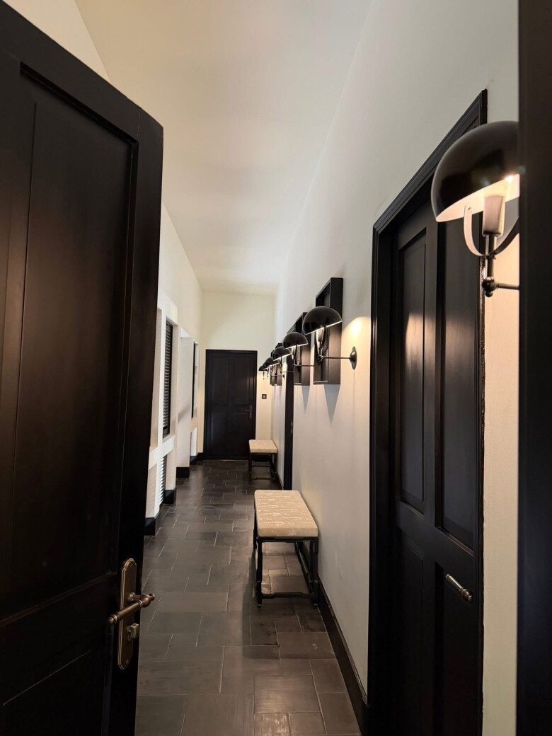 Hành lang dẫn lối vào các phòng gây ấn tượng bởi sự tương phản sắc nét giữa hệ cửa gỗ đen tuyền và tường trắng kem. Điểm xuyết dọc lối đi là ánh sáng vàng ấm áp từ dàn đèn tường tối giản, tạo nên một nhịp điệu kiến trúc đầy chiều sâu và dẫn dắt cảm xúc.