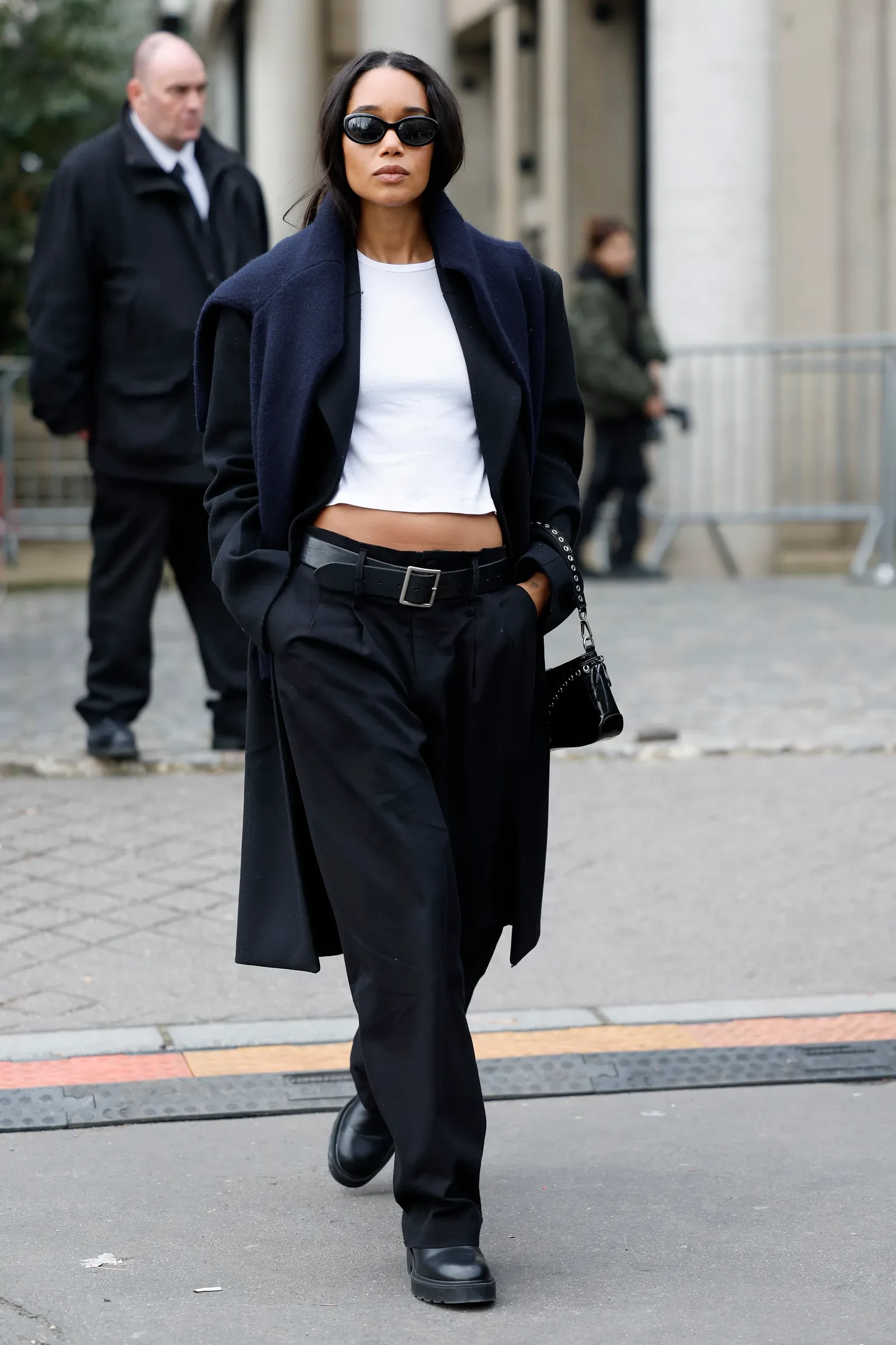Với những ai yêu thích bảng màu đen trắng tối giản và ưu tiên sự tiện dụng, đây là một gợi ý đáng thử. Quần tây xếp ly cạp thấp khi kết hợp cùng áo thun trắng dáng lửng sẽ giúp khoe khéo phần eo, tạo cảm giác trẻ trung và năng động.