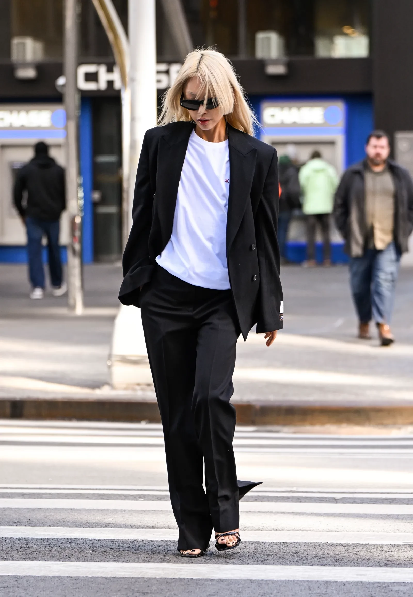 Điểm nhấn của trang phục nằm ở đôi sandal quai mảnh màu đen bóng, vừa tạo hiệu ứng bắt sáng nhẹ nhàng, vừa tăng thêm vẻ nữ tính. Chi tiết xẻ tà hai bên ống quần được tận dụng khéo léo để hé lộ đôi giày, giúp tổng thể trở nên cuốn hút và có chiều sâu hơn.