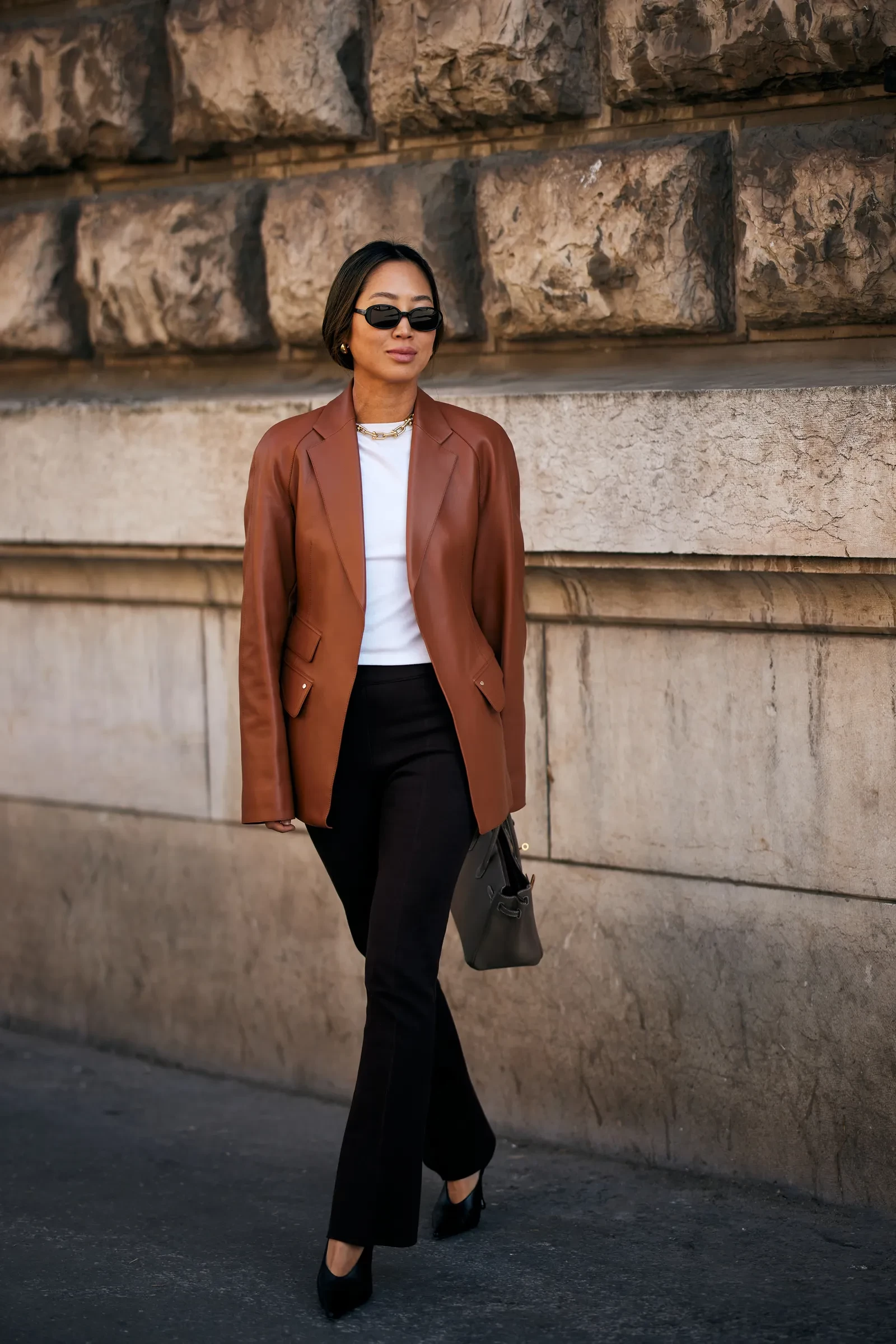 Để giảm bớt cảm giác quá trang trọng, bạn có thể khoác thêm áo da màu nâu (đặc biệt là tông nâu sô cô la) với phom dáng rộng. Cách layering này không chỉ tăng chiều sâu cho trang phục mà còn mang lại vẻ ngoài cá tính, thời thượng hơn.
