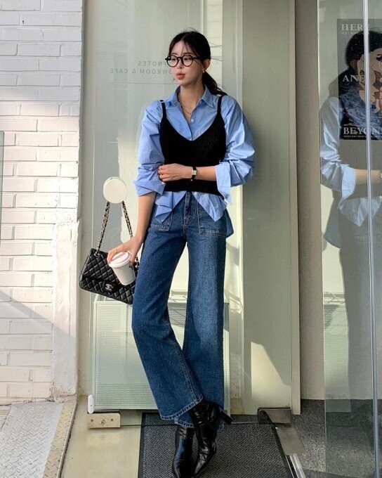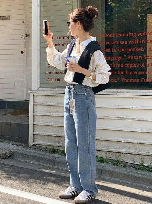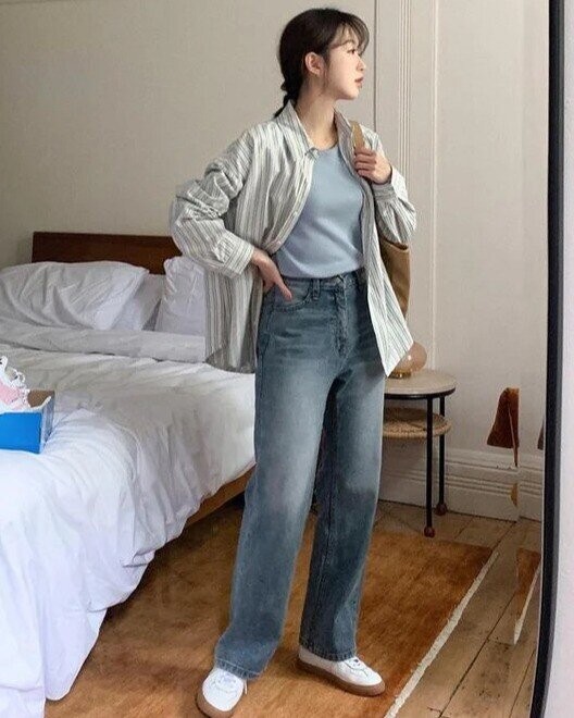 Jeans ống đứng giúp áo sơ mi trở nên trẻ trung và năng động hơn. Dáng quần gọn gàng, không quá bó, dễ phối đồ. Công thức này phù hợp cả đi làm lẫn dạo phố, tạo cảm giác thoải mái mà vẫn chỉn chu.