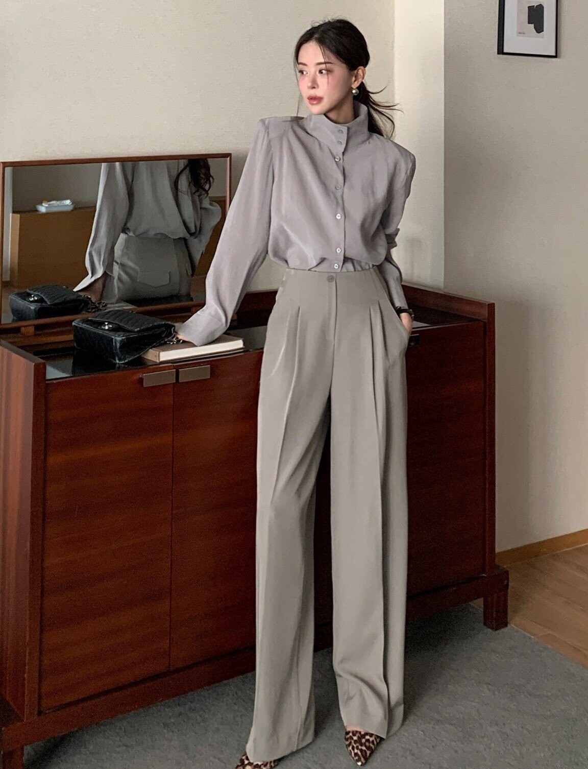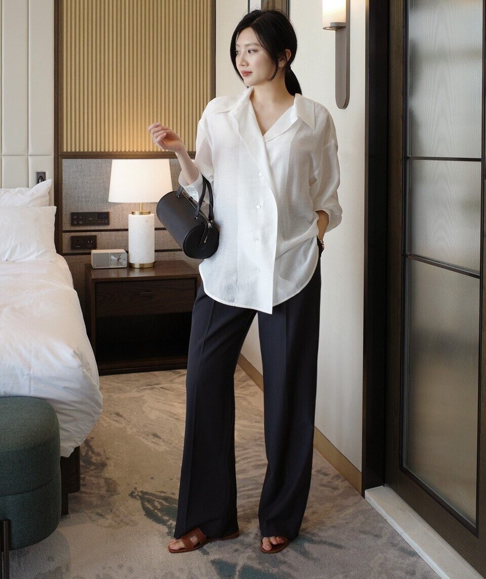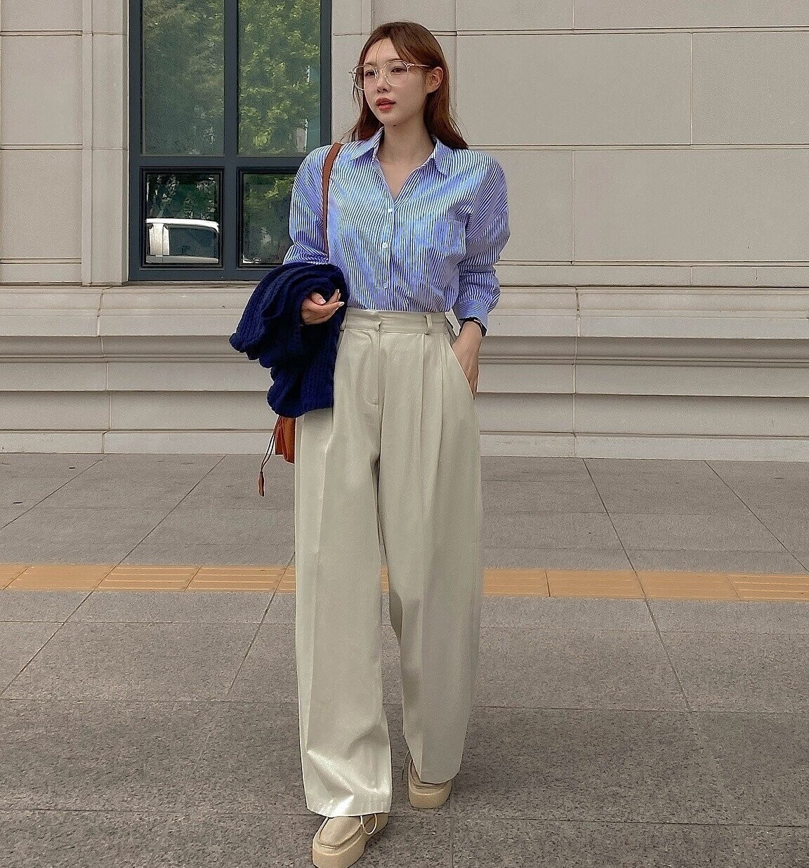 Quần âu ống suông, cạp cao khi kết hợp áo sơ mi sơ vin gọn gàng sẽ tạo hiệu ứng kéo dài chân rõ rệt. Để tránh cảm giác quá nghiêm túc, chị em có thể chọn áo sơ mi chất liệu mềm, cổ mở nhẹ hoặc tay phồng vừa phải.