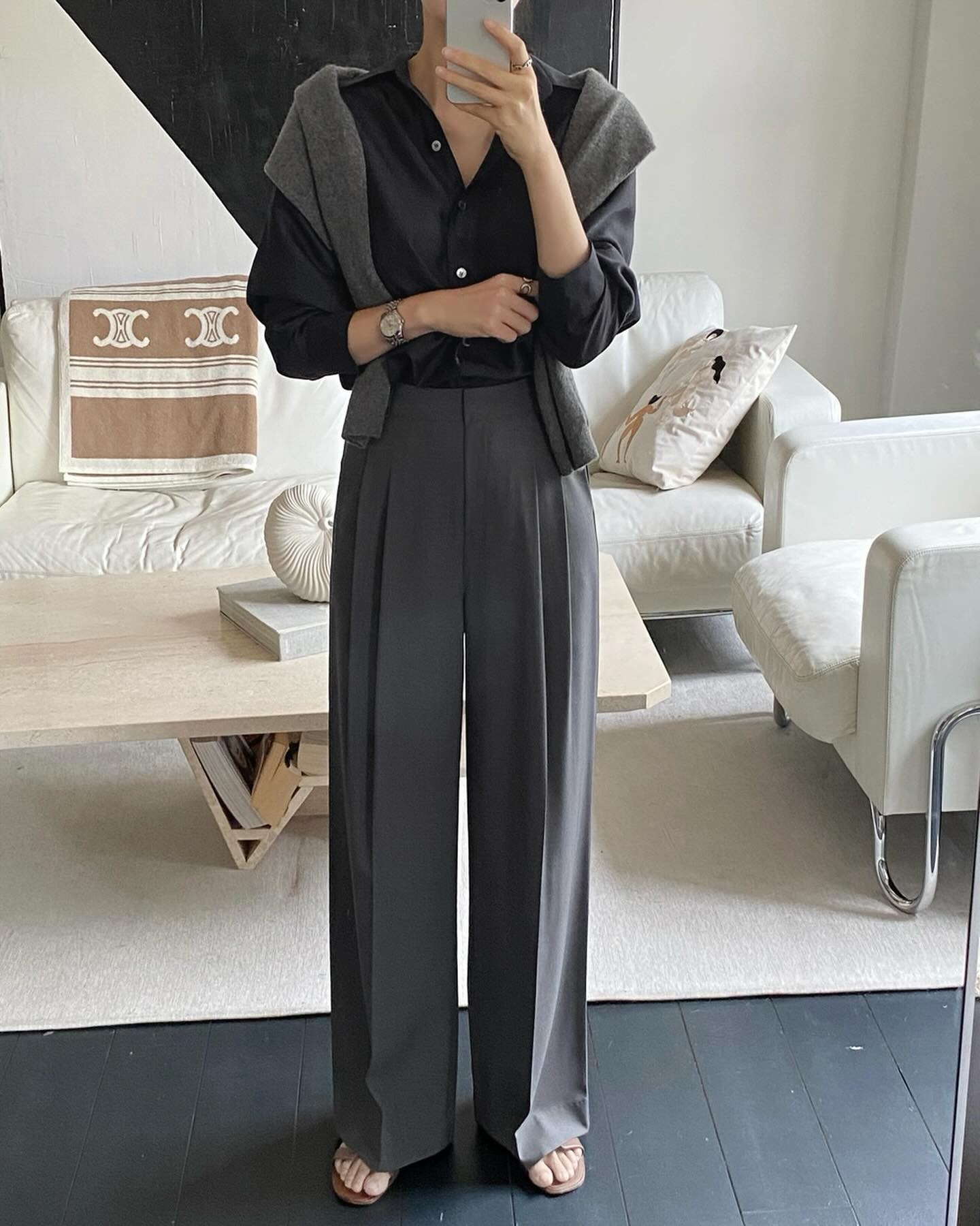 Quần âu phối áo sơ mi là công thức kinh điển nhưng chưa bao giờ lỗi thời. Dáng quần đứng, cạp cao giúp vóc dáng gọn gàng, tôn vòng eo. Khi chọn phom suông nhẹ, tổng thể sẽ bớt cứng nhắc và trẻ trung hơn.