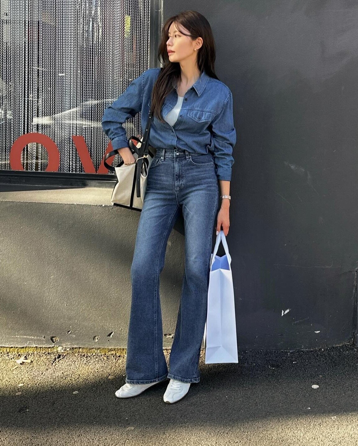 Khi phối áo sơ mi cùng quần jeans ống đứng, chị em có thể sơ vin toàn bộ để tạo vẻ chỉn chu, hoặc sơ vin một phần để tăng nét phóng khoáng. Đây là công thức rất dễ ứng dụng, phù hợp cho cả ngày làm việc lẫn những buổi dạo phố, cà phê sau giờ tan ca. Chỉ cần thay đổi giày và túi xách, set đồ đã có thể biến hóa linh hoạt theo nhiều phong cách khác nhau.