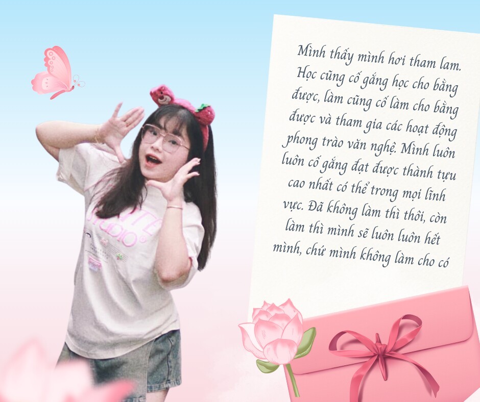 Gấp lại câu chuyện, Kim Trâm muốn nhắn gửi đến các bạn đồng trang lứa: “Hãy luôn là chính mình, luôn cố gắng hết sức, vì mình đã làm như vậy và đạt được chút thành quả nho nhỏ dù chưa thể gọi là thành công. Hãy học hỏi mỗi ngày, vì mình tin rằng khi còn hơi thở, còn sức lực, mình vẫn có thể tiến về phía trước.