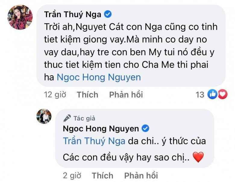 Câu chuyện của con trai ca sĩ Hồng Ngọc nhận được sự quan tâm của mọi người. Ai nấy đều khen ngợi cậu bé giản dị, có ý thức tiết kiệm tốt và yêu thương bố mẹ. Trong đó, Thuý Nga để lại bình luận đáng chú ý: "Trời ạ, Nguyệt Cát con Nga cũng có tính tiết kiệm giống vậy. Mà mình có dạy nó vậy đâu, hay trẻ con bên Mỹ tụi nó đều ý thức tiết kiệm tiền cho cha mẹ thì phải ha Hồng Ngọc".