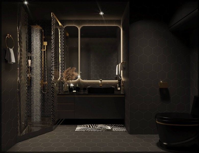 Vì yêu thích màu đen nên phòng tắm của Minh Quân cũng mang màu sắc này, trông vô cùng tinh tế và sang trọng. Được biết, để thiết kế và cải tạo phòng tắm này, anh đã tốn 250 triệu đồng.
