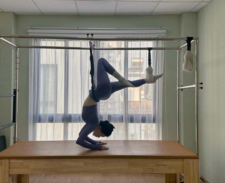 Tiếp theo, vợ sắp cưới Phillip Nguyễn dành 45 phút cho bộ môn pilates: "Khởi đầu cho mỗi bài tập pilates là tập thở nên cũng rất thích hợp với việc thư giãn sau chạy bộ và điều chỉnh lại nhịp thở của mình. Tôi thường tập sớm nên luôn tập một mình với huấn luyện viên và chỉ gắn bó với một huấn luyện viên duy nhất để duy trì các bài tập ổn định cũng như phát triển bài tập theo mong muốn cá nhân".