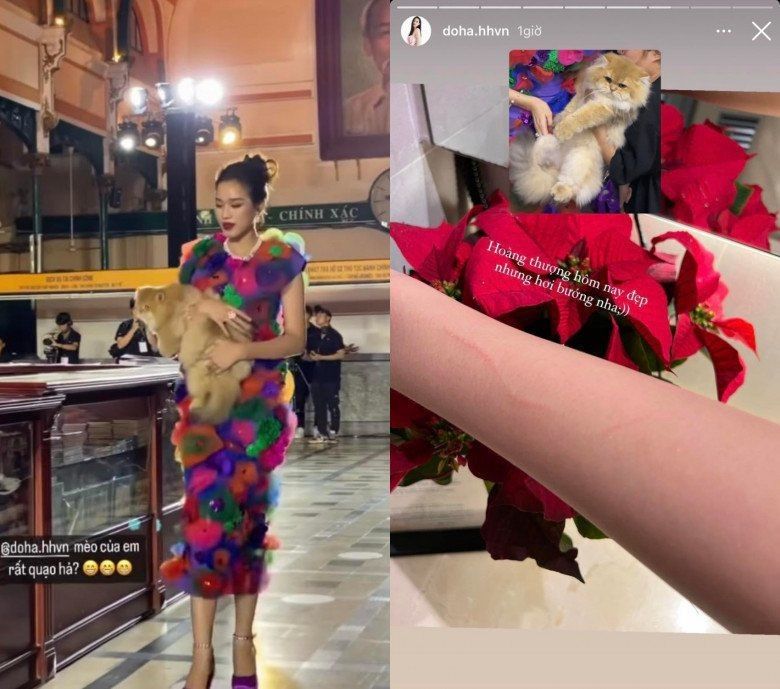 Hay trong một show diễn gần đây hơn, Lương Thuỳ Linh và Đỗ Hà gặp sự cố "đổ máu" trên sàn diễn. Cụ thể, 2 nàng Hậu phải trình diễn với một chú mèo thật ôm trên tay.