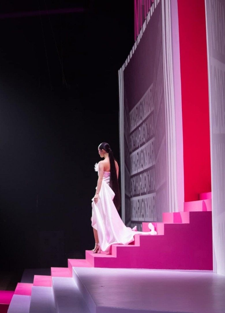 Hoa hậu Hoà Bình Thế giới 2021 Nguyễn Thúc Thuỳ Tiên cũng từng được ưu ái giao vai trò vedette trong một show diễn. Nàng hậu "náo loạn" sân khấu trong bộ váy cánh bướm, với phần cánh to và phần tà dài cầu kỳ.