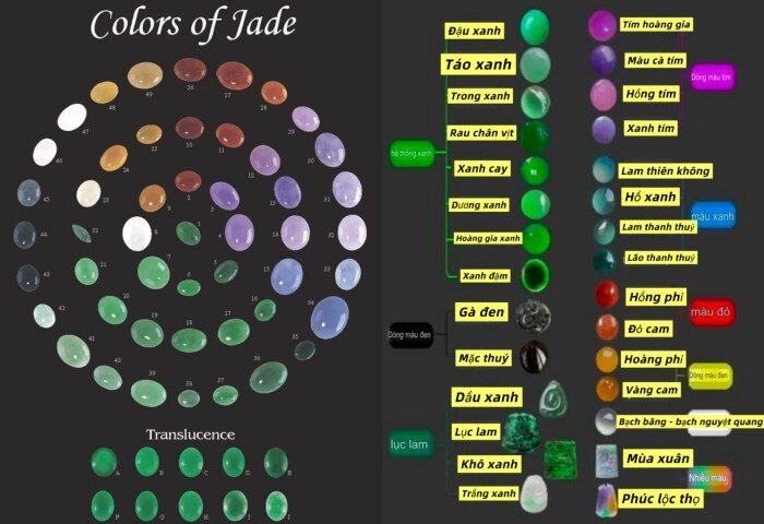 Phỉ thúy là loại ngọc có bảng màu rất phong phú do hình thành từ các nguyên tố khoáng khác nhau trong lòng đất. Nhờ đó, cùng một loại đá nhưng có thể xuất hiện nhiều gam màu như xanh lục, tím, đỏ, vàng, trắng, đen, lam hoặc đa sắc. Trong số này, xanh lục là màu nổi bật và được ưa chuộng nhất trên thị trường.