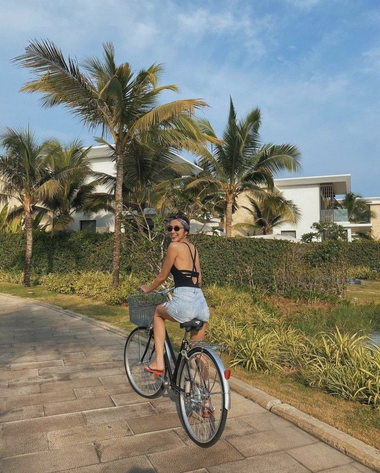 Tăng Thanh Hà tranh thủ đạp xe khi đi nghỉ dưỡng.