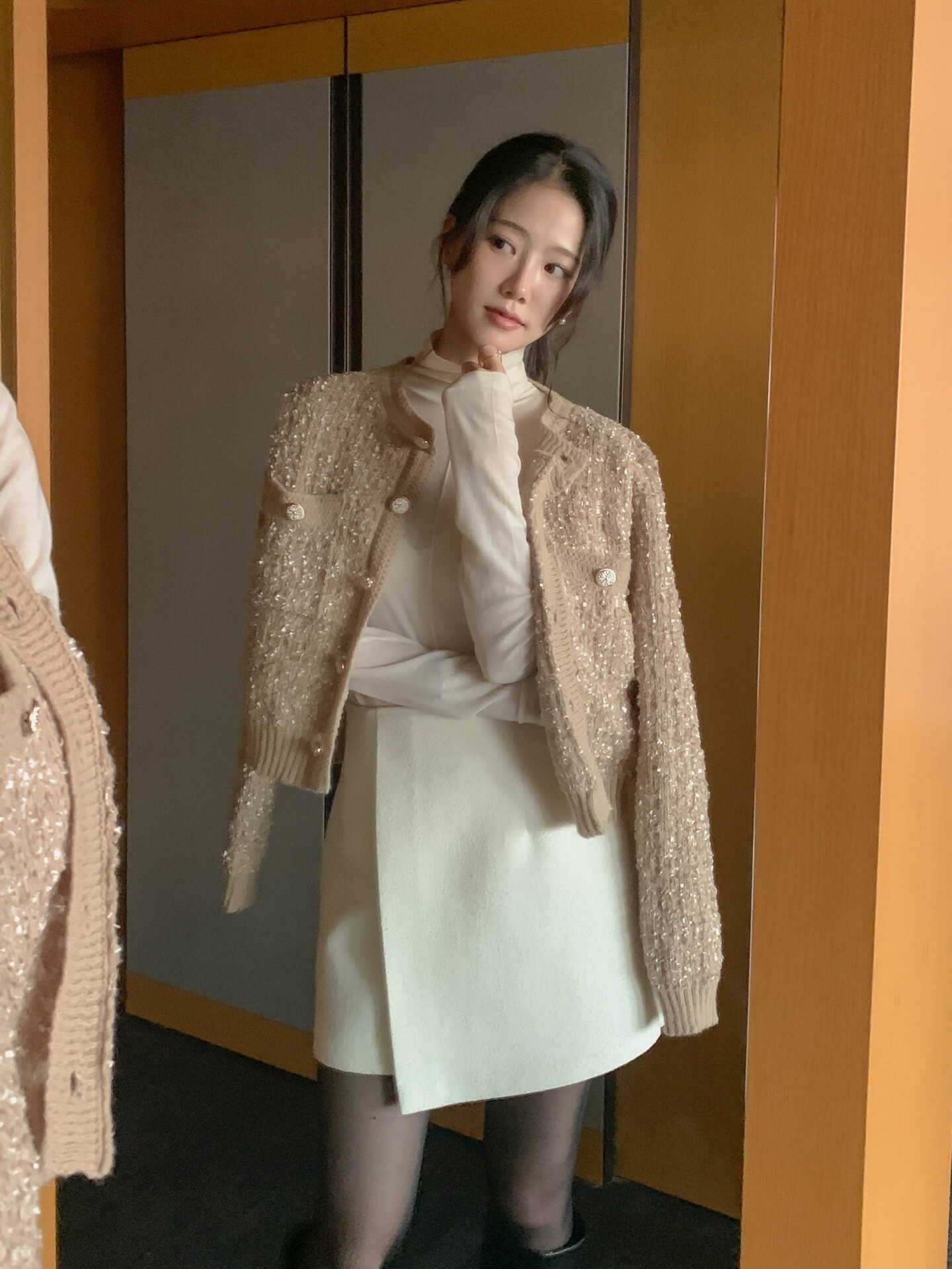 Với những ngày Tết thời tiết se lạnh, chân váy dạ là lựa chọn vừa giữ ấm tốt vừa đảm bảo tính thời trang. Chất liệu dạ đứng form giúp tổng thể trông gọn gàng, chỉn chu hơn so với các chất liệu mỏng nhẹ.