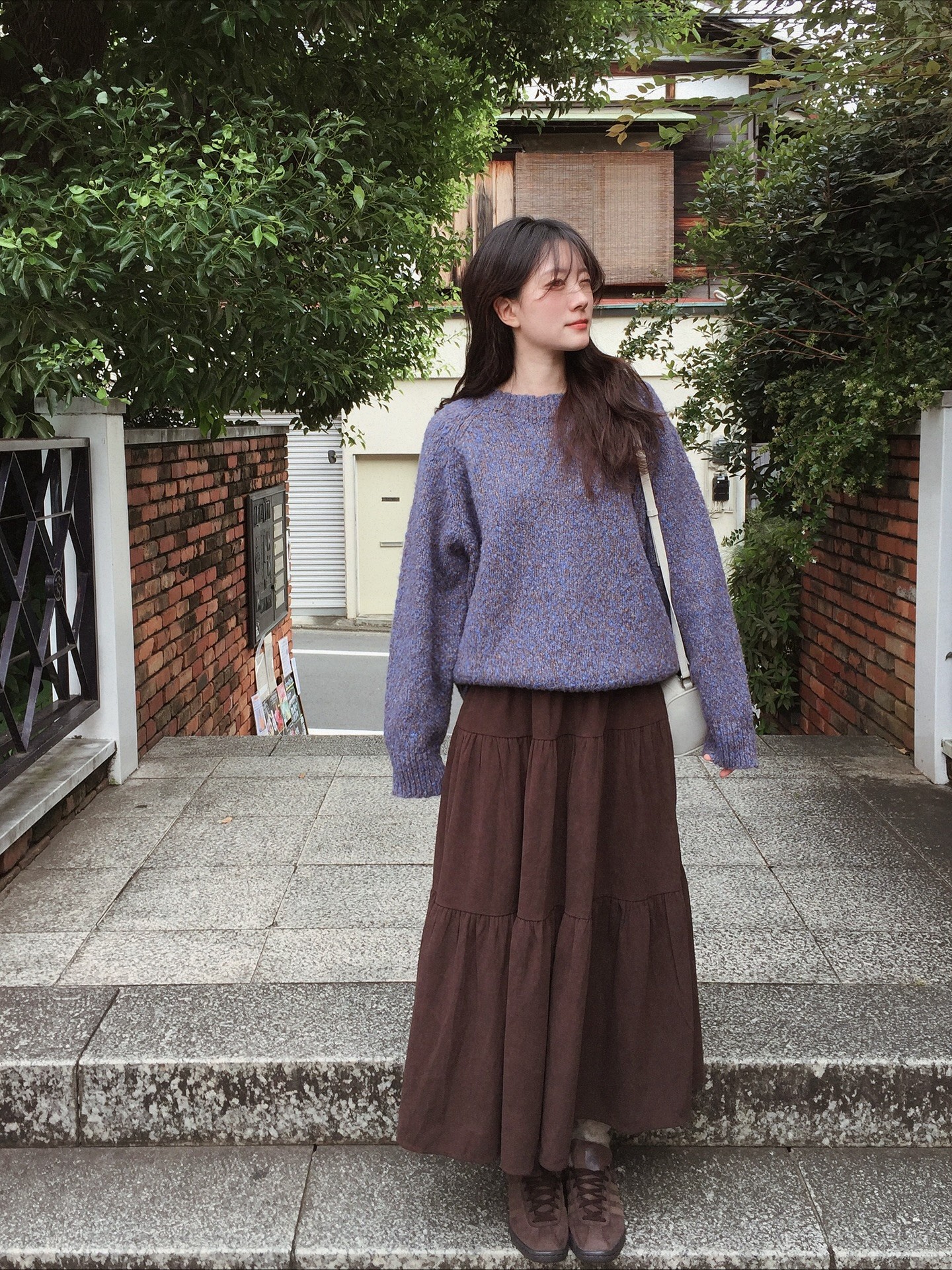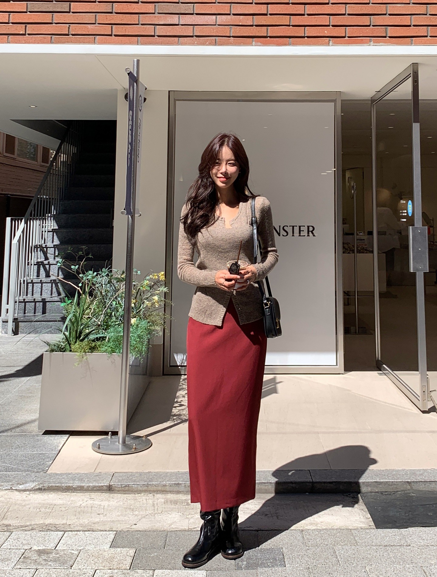 Gam màu nâu chocolate hoặc đỏ rượu mang lại cảm giác ấm áp, rất hợp không khí Tết. Chân váy tông màu này giúp outfit có điểm nhấn rõ rệt khi lên hình. Chỉ cần phối cùng áo trắng, be hoặc đen là đã đủ nổi bật mà không cần quá nhiều phụ kiện.