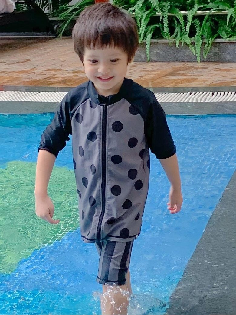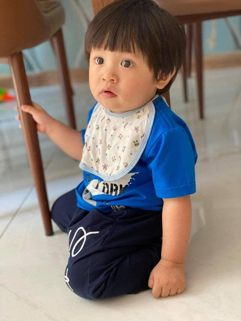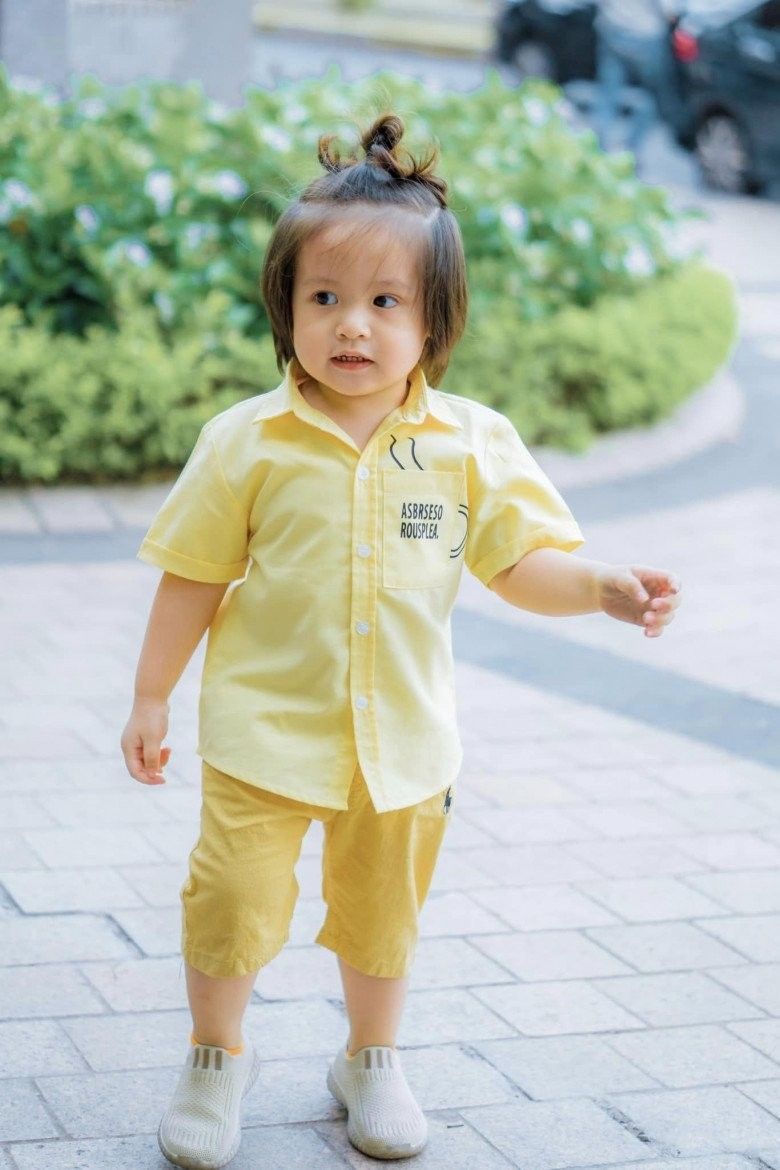 Dù với kiểu tóc nào, nhóc tỳ cũng trông vô cùng đáng yêu, điển trai. Con sở hữu làn da trắng giống mẹ, khuôn mặt "đúc khuôn" đạo diễn Đức Thịnh, ngũ quan sáng sủa với điểm nhấn là đôi mắt to tròn long lanh.