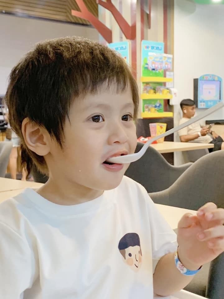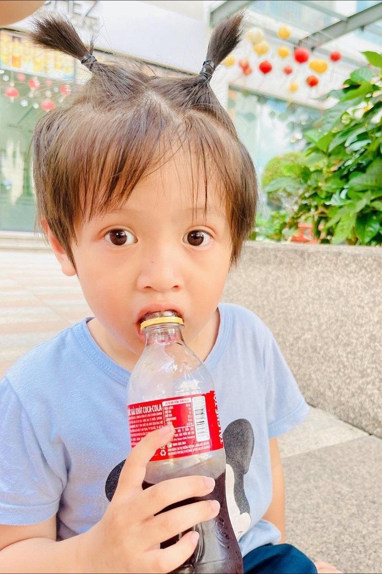Trước khi uốn xoăn, quý tử nhà Thanh Thúy để tóc thẳng băng.