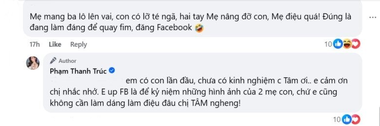 Trước nhận xét có phần tiêu cực này, nữ diễn viên đã bình tĩnh đáp trả nhẹ nhàng, lịch sự rằng: “Em có con lần đầu nên chưa có kinh nghiệm chị ơi. Em cảm ơn chị đã nhắc nhở. Em đăng lên là để kỷ niệm những hình ảnh của hai mẹ con, chứ em cũng không cần làm dáng làm điệu đâu chị nhé!".