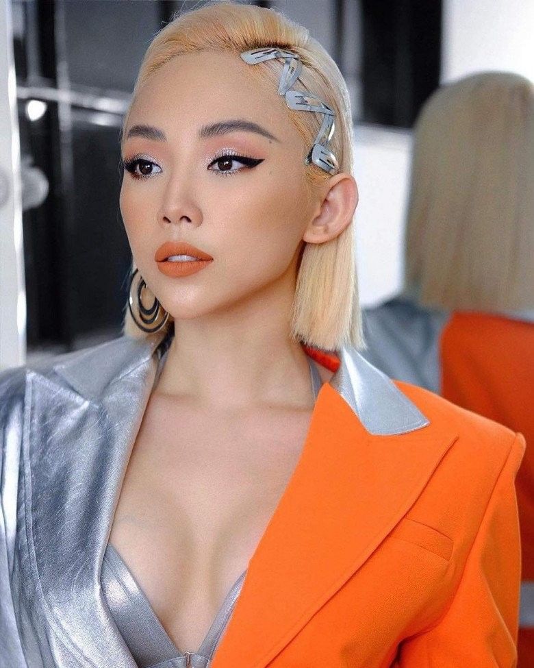 Tóc tẩy càng nên được chăm chút, tạo kiểu kỹ càng và phối thêm phụ kiện sẽ mang tới hiệu ứng hoàn toàn nổi bật. Tóc Tiên chính là một trong những gương mặt quen thuộc với nhiều kiểu tóc tẩy cuốn hút.