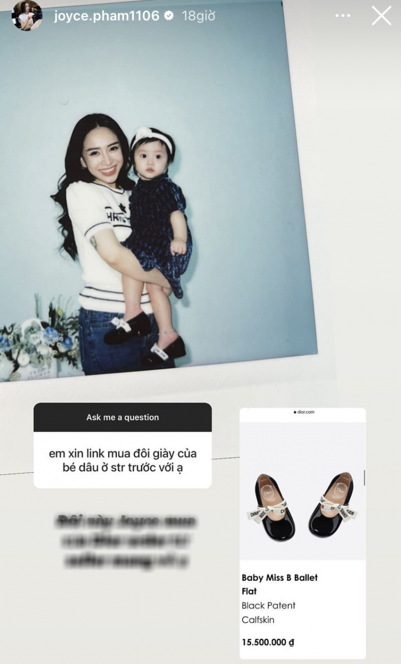 Trả lời thắc mắc của fan, bà mẹ bỉm sữa không ngại công khai item hàng hiệu của con. Được biết, nhóc tỳ Dâu mang đôi giày Baby Miss B Ballet Flat có giá hơn 15 triệu đồng. Đồng thời, với những tín đồ hàng hiệu, dễ dàng nhận ra chiếc váy màu xanh của cô nhóc cũng là một item đến từ cùng nhà Dior. Chiếc váy này có giá trên dưới 14 triệu đồng.