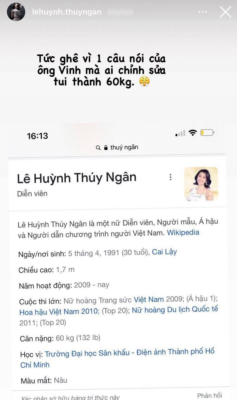 Cụ thể từ 56kg như bình thường, Thúy Ngân đã bị nâng lên thành 60kg. Điều này khiến Á hoàng Trang sức 2009 khá giận, cô chia sẻ: "Tức ghê vì 1 câu nói của ông Vinh mà ai chỉnh sửa tôi thành 60kg".