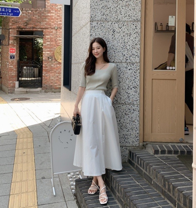 Váy trắng mang lại vẻ nữ tính nhưng vẫn kín đáo, phù hợp nhiều hoàn cảnh. Độ dài qua gối giúp tổng thể thanh lịch hơn. Khi phối cùng sandal mảnh hoặc giày cao gót, váy trắng tạo hiệu ứng nhẹ nhàng, giúp diện mạo trở nên thanh thoát và duyên dáng.