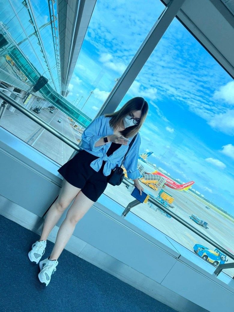Thỉnh thoảng, Thiện Nhân cũng diện những chiếc quần short khoe đôi chân trắng ngần. Cô nàng cũng rất biết cách mix & match khi biến tấu áo sơ mi thành áo croptop thời thượng.