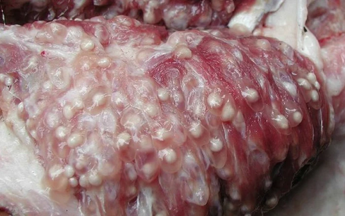 Nếu quan sát thấy trong thớ thịt xuất hiện những hạt trắng nhỏ giống như hạt gạo, bạn tuyệt đối không nên mua. Đây là dấu hiệu của thịt bị nhiễm ấu trùng sán.