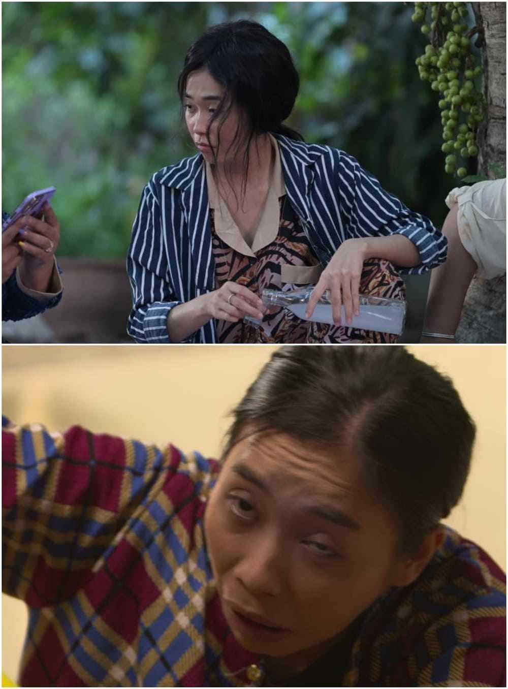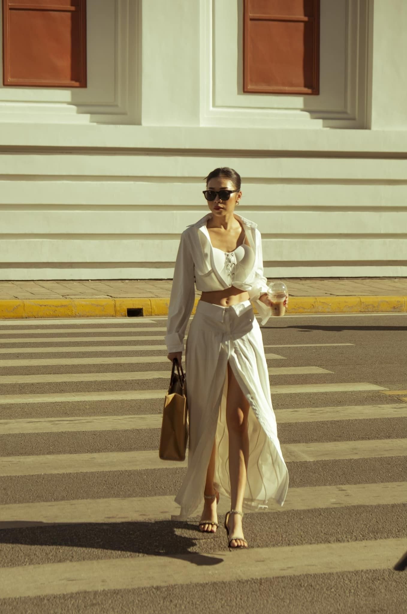 Người đẹp diện áo đồng phục của chương trình sơ vin gọn gàng cùng với quần ống vẩy tôn dáng. Đi được một đoạn, cô đã bị trật khớp chân và suýt "vồ ếch".