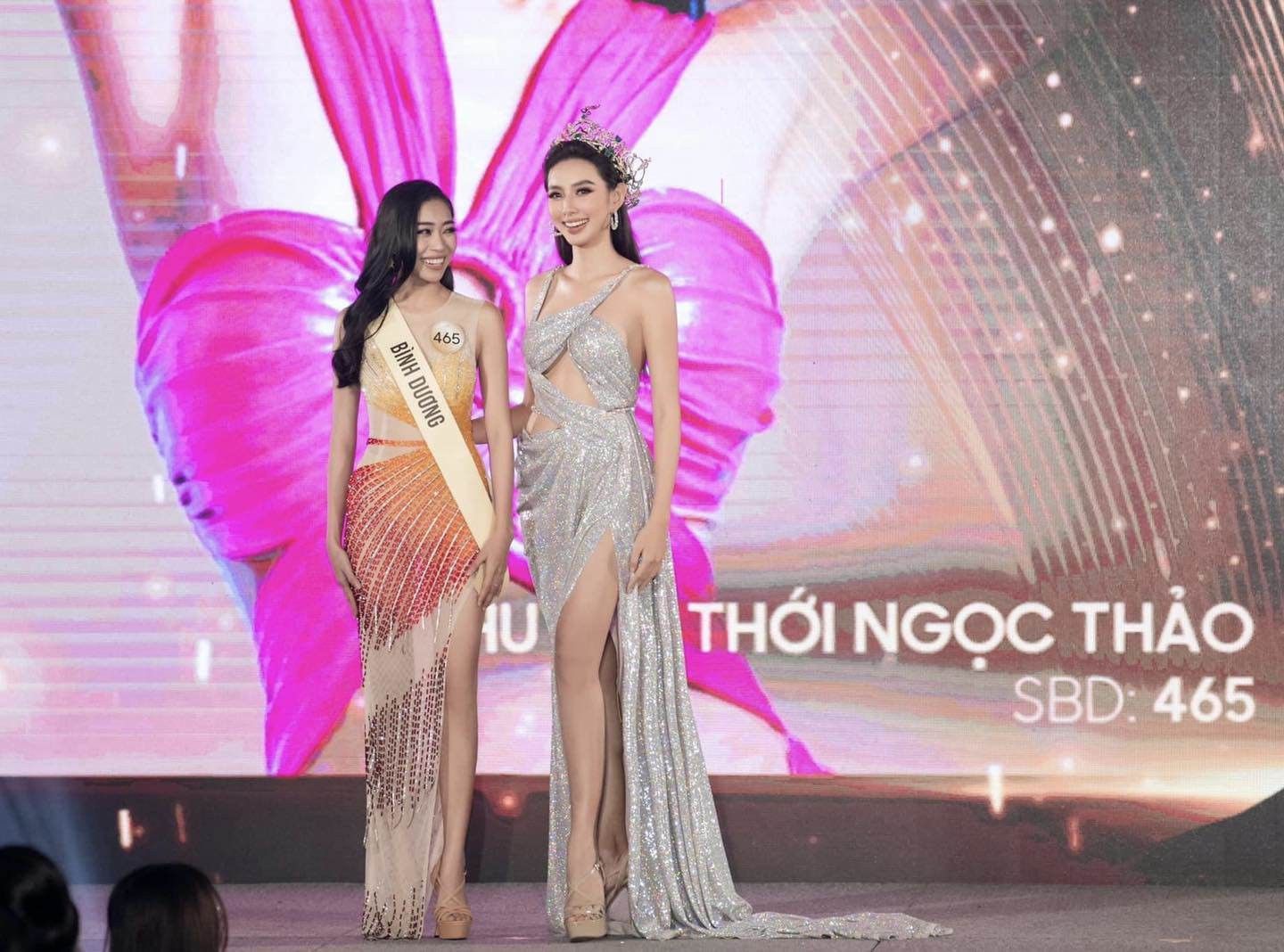 Ngọc Thảo sở hữu vóc dáng nhỏ nhắn nên khi khoác lên mình các thiết kế dạ hội rất nữ tính và thướt tha. Trong buổi trao nhận sash, Ngọc Thảo đứng kế Thuỳ Tiên và không hề bị dìm sắc vóc.