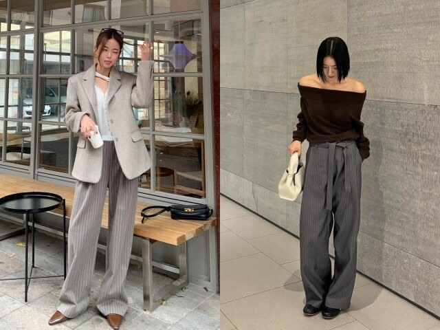 Quần kẻ ống rộng ghi điểm nhờ họa tiết kẻ dọc giúp kéo dài đôi chân và tạo cảm giác cao ráo. Kiểu quần này mang lại vẻ ngoài chỉn chu, rất hợp môi trường công sở. Khi phối cùng áo trơn màu, tổng thể trang phục trông tinh tế, sang trọng mà không cần cầu kỳ.