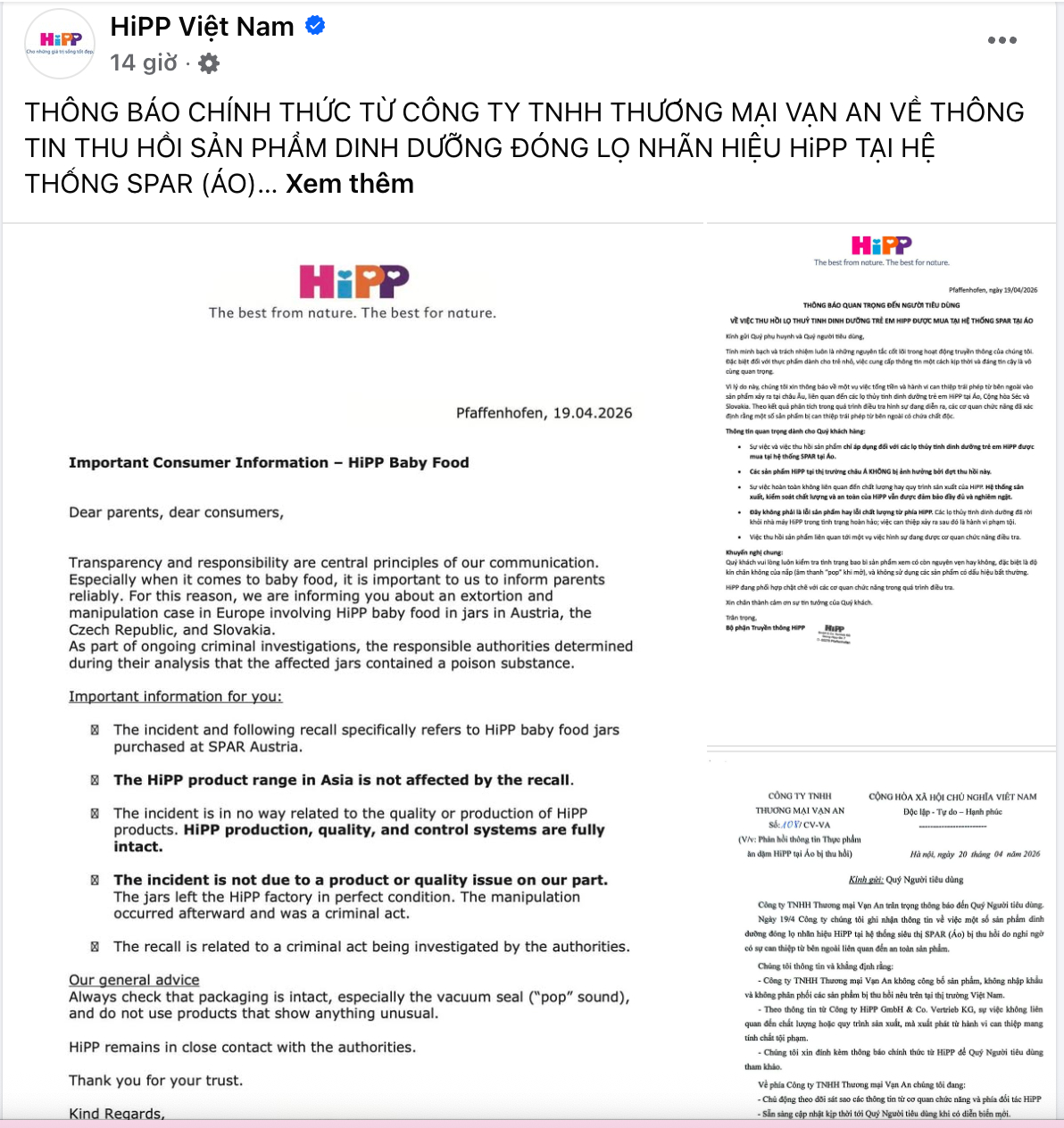 Kèm theo thông báo, Công ty TNHH Thương mại Vạn An cho biết đã đính kèm văn bản chính thức từ HiPP để đối tác và người tiêu dùng tham khảo.