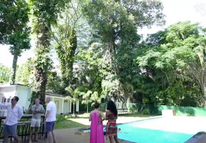 Căn biệt thự bên ngoài là vườn và khu bể bơi, tổ chức tiệc ngoài trời.