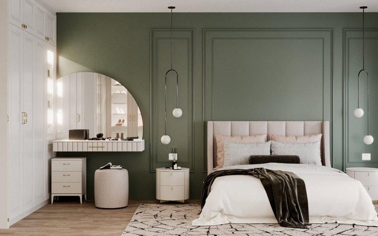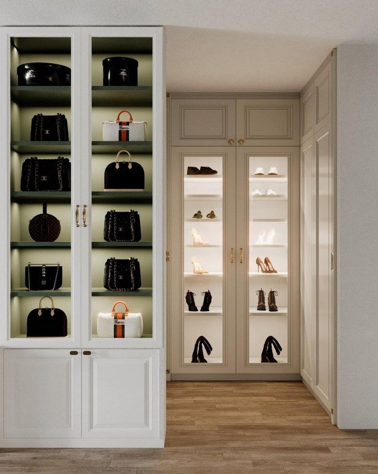 Phòng để đồ và phòng ngủ được ngăn cách bởi kệ tủ đựng túi xách.