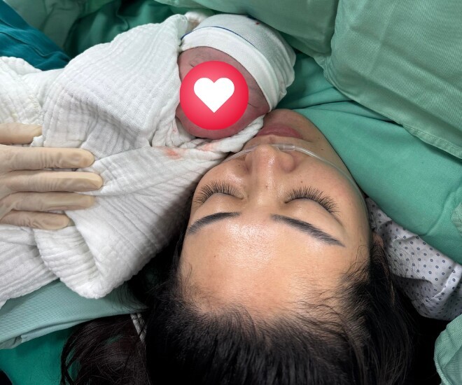Trên trang cá nhân, Tiến Lộc đăng tải khoảnh khắc đầy xúc động trong phòng sinh khi vợ anh đang “da kề da” cùng con trai vừa chào đời. Trong bức ảnh, em bé nằm gọn trên ngực mẹ, gương mặt nhỏ xíu bất ngờ nhoẻn miệng cười đáng yêu, tạo nên một khung hình ấm áp và thiêng liêng. Dù vừa trải qua hành trình vượt cạn, bà xã nam diễn viên vẫn gây chú ý với gương mặt mộc rạng rỡ, thần thái tươi tắn.