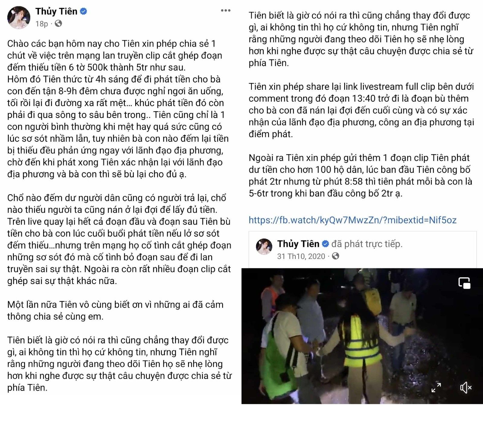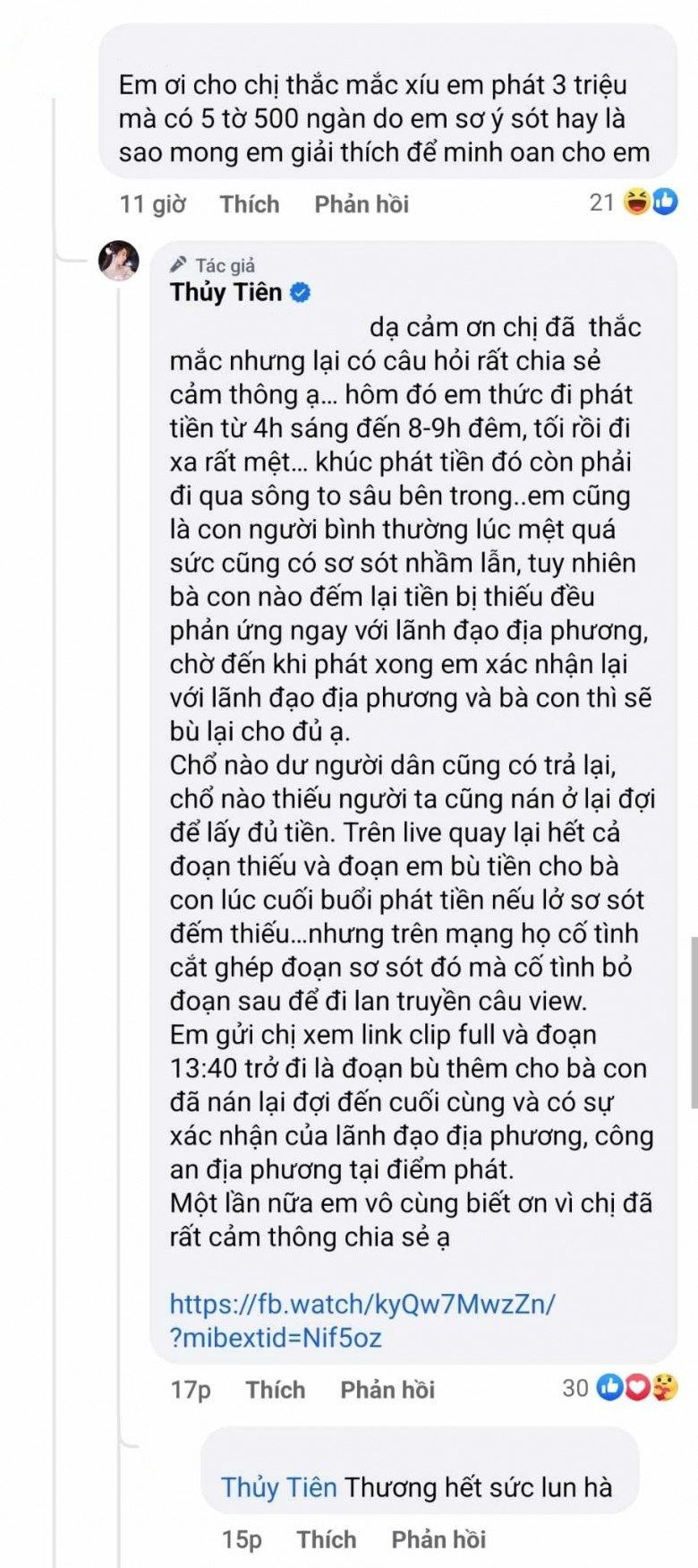 Nối tiếp bình luận trên, Thủy Tiên đã có bài đăng dài phân trần thêm về trường hợp phát 5 triệu nhưng chỉ có 6 tờ 500.000 đồng. Nữ ca sĩ chia sẻ lại video ghi hình trực tiếp buổi phát tiền từ thiện hồi năm 2020, chứng minh bản thân có phát tiền bù và có xác nhận của lãnh đạo địa phương, công an địa phương tại điểm phát.