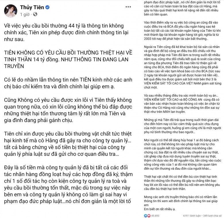 Nội dung bài đính chính của Thủy Tiên: "Tiên không có yêu cầu bồi thường thiệt hại về tinh thần 14 tỷ đồng như thông tin đang lan truyền. Cũng không yêu cầu xin lỗi vì Tiên thấy không quan trọng nữa, có xin lỗi cũng không thể bù đắp được những thiệt hại tổn thương tâm lý rất lớn mà Tiên và gia đình đang phải gánh chịu.