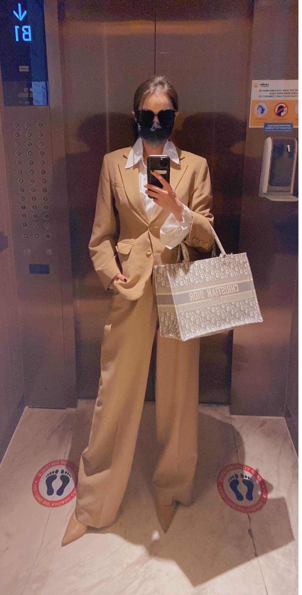 Khi đi chơi mặc trẻ trung nhưng khi đi làm, Thủy Top lại "hiện nguyên hình" quý cô thành đạt, trưởng thành với đồ vest/suit/. Điều làm nên điểm nhấn của một doanh nhân triệu đô là những chiếc túi xách, đồng hồ kim loại sang trọng.