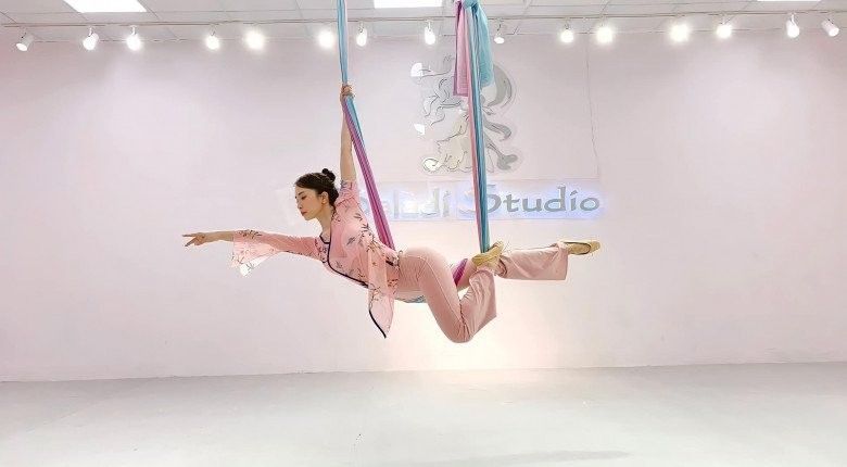 Quỳnh Nga giờ gắn bó mật thiết với múa và yoga bay. Cô luôn chiêu mộ fan với các thế tạo dáng hệt như phim cổ trang với dụng cụ dây trong tập luyện.