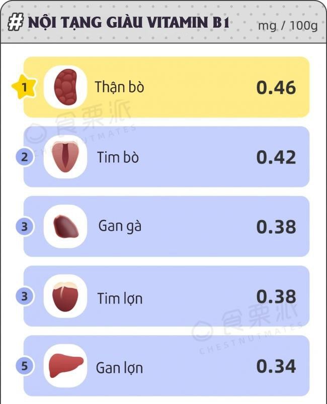 Trong các cơ quan nội tạng, hàm lượng vitamin B1 trong gan, thận và tim tương đối cao, hàm lượng trong dạ dày ít hơn.