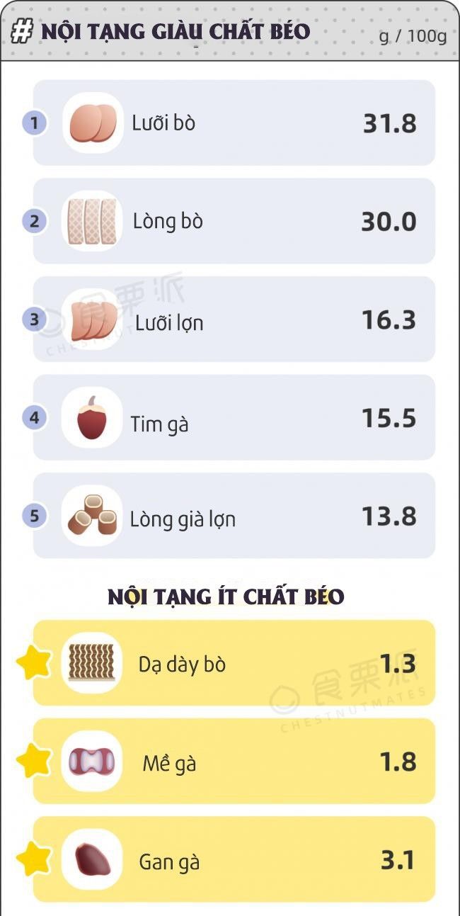 Thực tế, hàm lượng chất béo trong nội tạng động vật không quá cao như mọi người nghĩ. Hàm lượng chất béo trong gan của động vật vỗ béo như gan ngỗng tương đối cao, nhưng hàm lượng chất béo trong gan bình thường thường dưới 5%, thấp hơn so với thịt nạc; hàm lượng chất béo trong thận, dạ dày, tim và não là phần lớn dưới 10%.